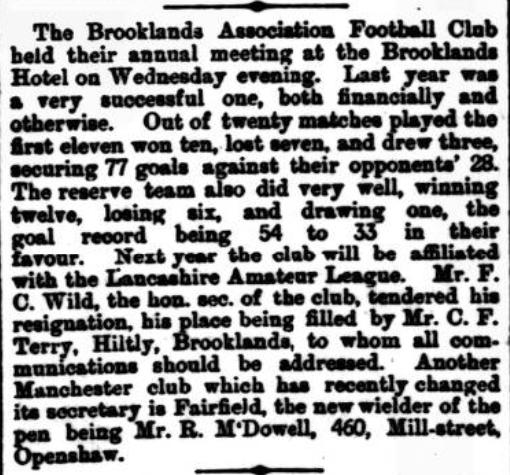 • Brooklands publicly announced at their AGM on 21 June 1893 that they were joining the new league, now named as the Lancashire Amateur League