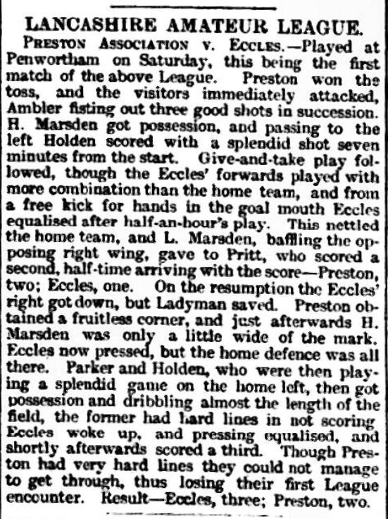 • The league got underway on Sat 7 October 1893, and with 7 clubs in this first season, so there would be 12 league games played each throughout the season. Remaining dates would be filled with friendlies and county cup ties. The first game played was at Penwortham, as reported by the Preston Herald: