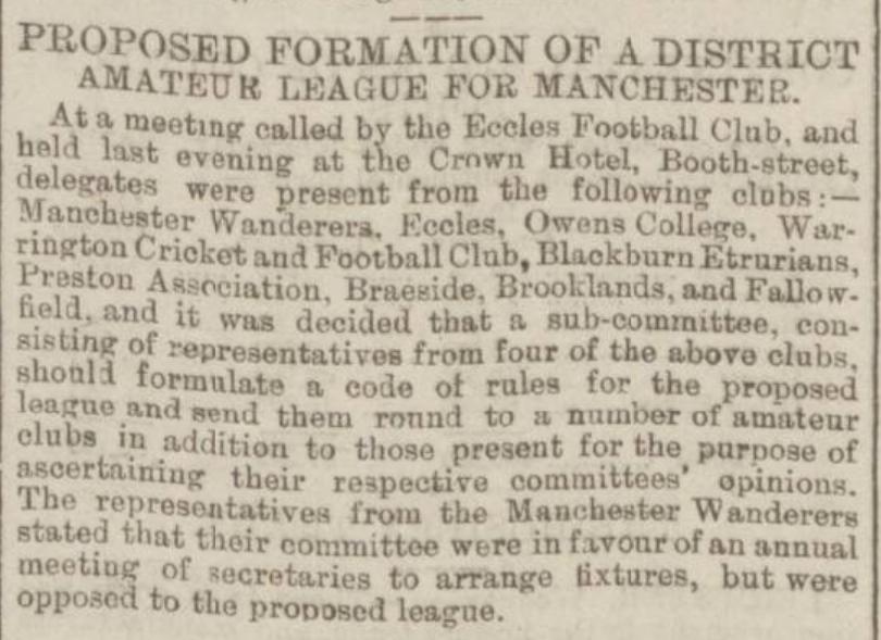 • Manchester Wanderers made it quite clear in the meeting notes, that while they agreed with an annual meeting of club secretaries to arrange fixtures, they were opposed to the formation of the new league - though they did end up joining a different league instead - the Manchester Alliance, which had formed the previous season